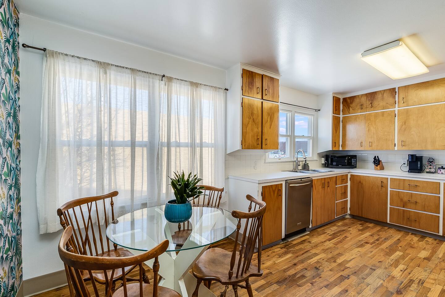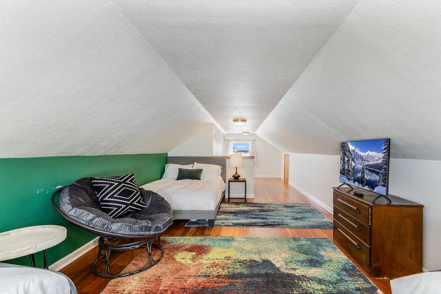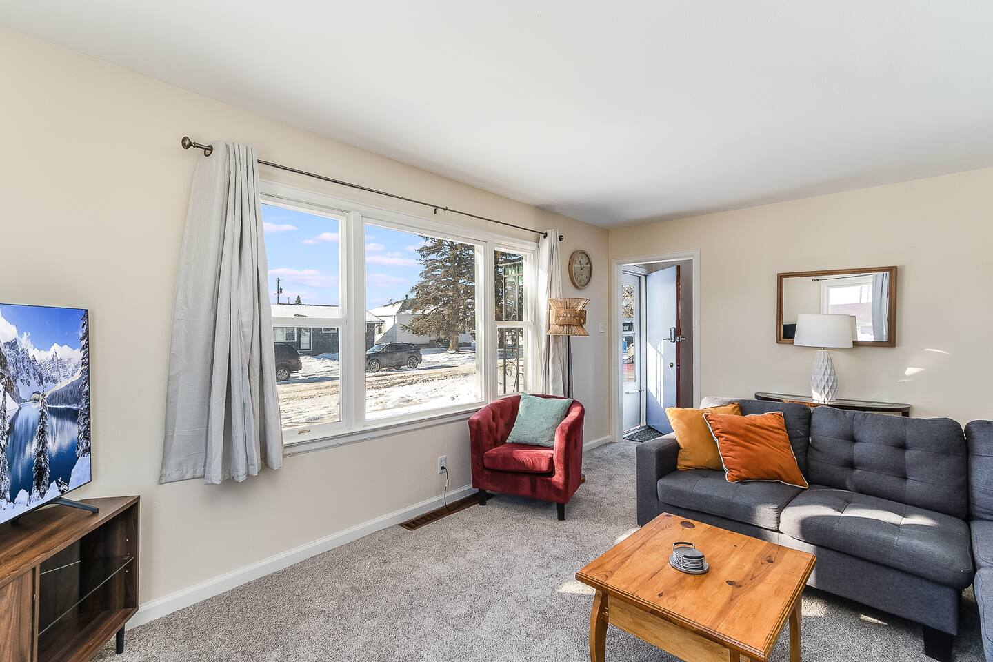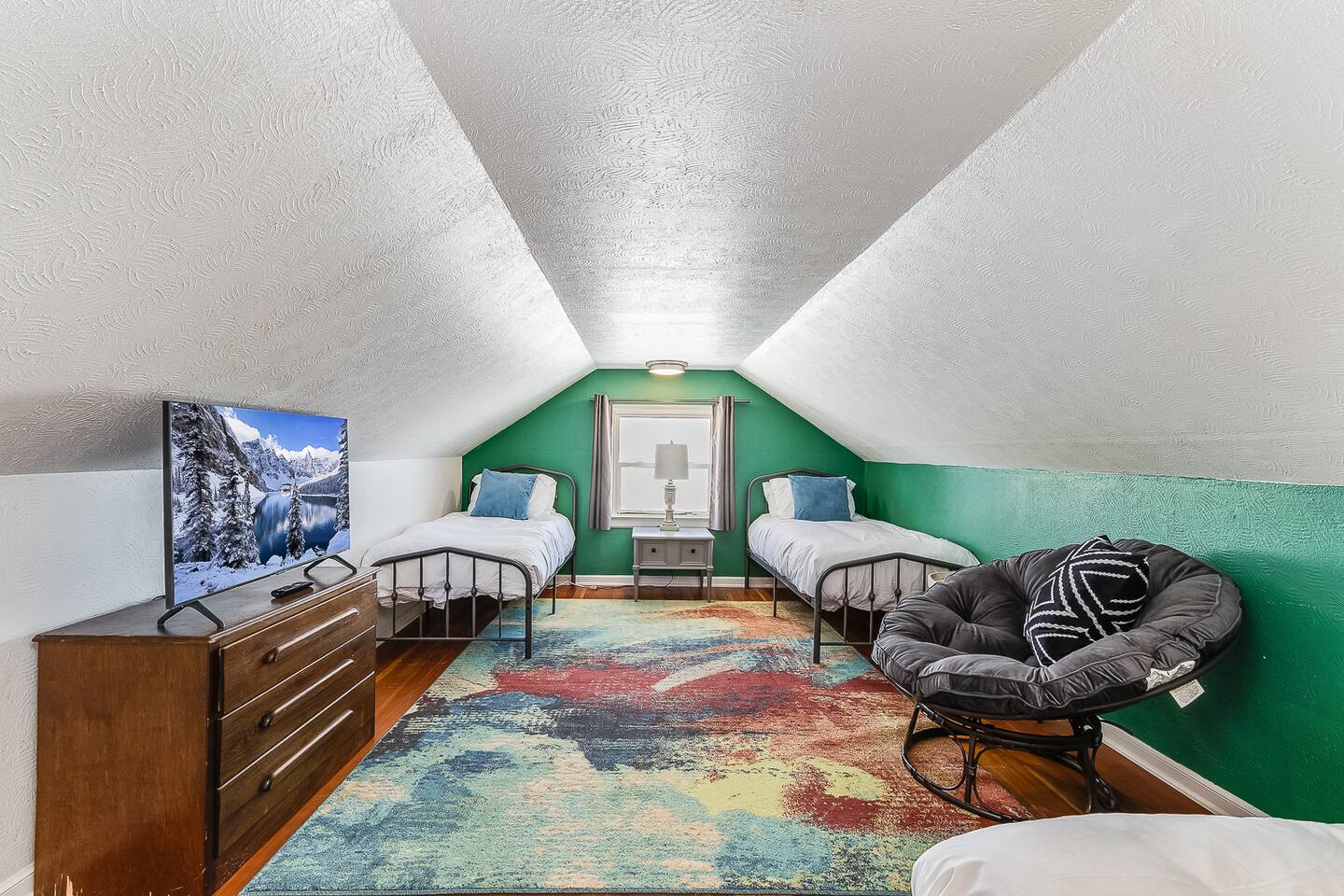 The home is perfect for groups or families. The five beds can comfortably accommodate up to 8 people. There is a generous sized living room for lounging. The full kitchen is equipped with dishes and cookware for your convenience and features a round dining table with seating for four. There is a full-size bathroom with tub/shower combo. Finally, for your laundry needs you can access the laundry room featuring coin-operated machines that is shared with a basement apartment.