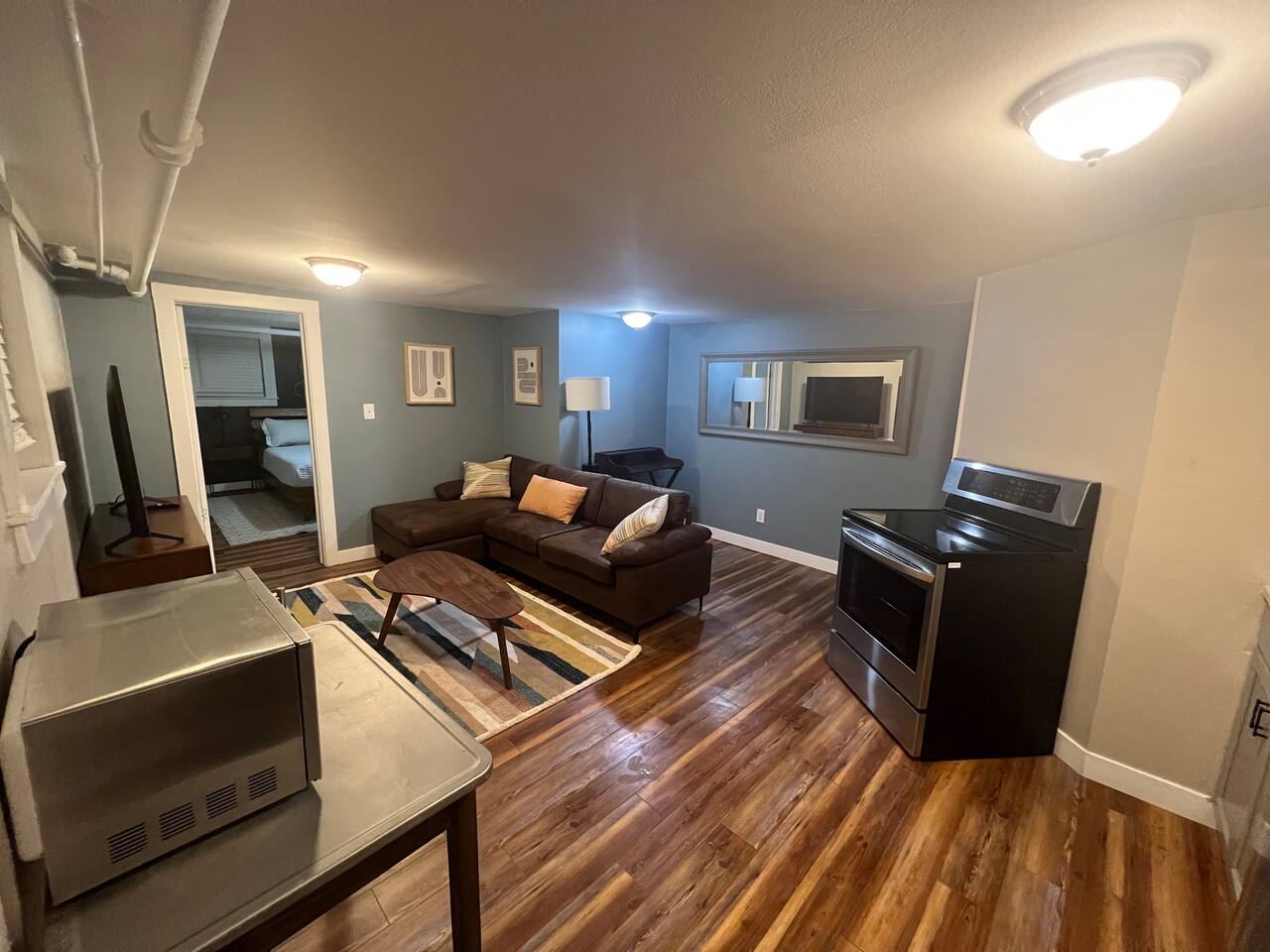 The bedroom is outfitted with a pillow-like memory foam king-size mattress and crisp linens. The living room boasts a Smart TV for all of your streaming needs. There is also a full kitchen equipped with cookware and dishes. Finally, the apartment has a full bathroom and any laundry needs can be met with the coin-op washer and dryer on site.